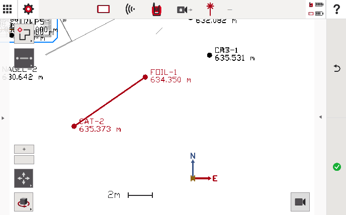 Nyomd meg a piros mérő gombot a vonal véglegesítéséhez, majd a zöld pipát. Ha nem nyomod meg a zöld pipát, a vonal nem kerül mentésre a digitális fájlba. Megjegyzés: csak a vonal kerül mentésre, nem azok a pontok, amelyeket a vonal létrehozásához mértél: