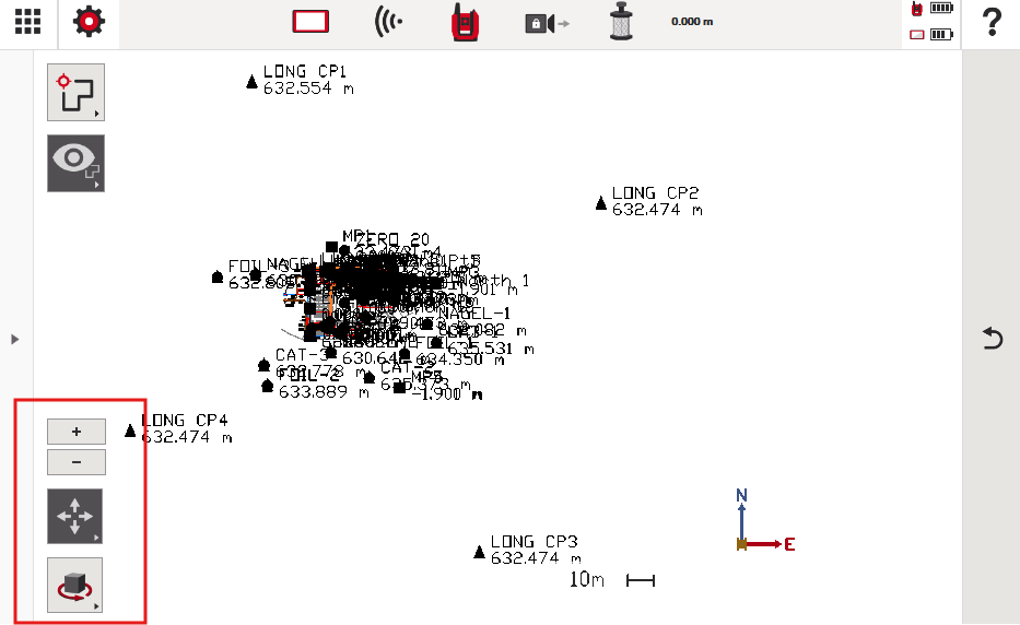 Kicsinyítés: A fekete négyzet piros nyilakkal a közepén lehetővé teszi, hogy gyorsan kicsinyítsen a fájlban, hogy lássa az összes pontot és CAD elemet, ami a CAD területen belül van. Megjegyzés - ha fájlja elemei rendkívül nagy távolságra vannak egymástól, a CAD nézet területe üresnek tűnhet ennek az opciónak a használatakor.