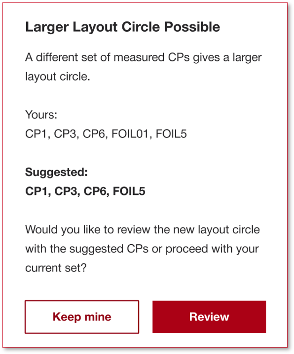 Questo messaggio di richiesta finale apparirà dopo che un utente accetta un risultato di stazionamento di un punto di controllo. Per farlo apparire, però, 1) l'utente finale deve aver misurato almeno 4 punti di controllo, 2) l'utente finale deve aver impostato una tolleranza nelle impostazioni, e 3) il risultato calcolato da HCL deve aumentare l'area di layout possibile entro la tolleranza impostata di almeno il 20%.