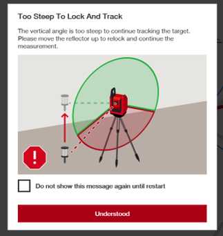 Per migliorare l'esperienza utente durante il tracciamento di un prisma, Hilti Construction Layout mostrerà ora un messaggio pop-up che avvisa l'utente che un prisma non può essere tracciato quando è verticalmente troppo ripido e fuori portata per essere tracciato (tra 125° e 235° in verticale). Questo dovrebbe aiutare gli utenti finali a risolvere il problema regolando l'altezza del prisma o l'altezza dello strumento nella loro area di lavoro.
