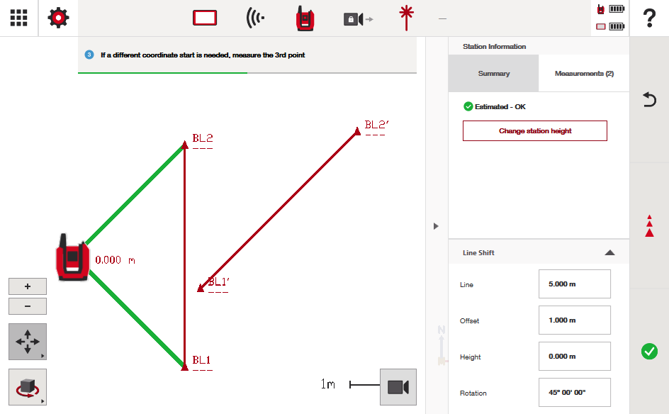 La tua stazione è ora stabilita e ha una posizione coordinata basata sulla linea che hai misurato. Ora puoi iniziare a fare varie applicazioni, in particolare misurare e registrare le condizioni as-built nel tuo cantiere.