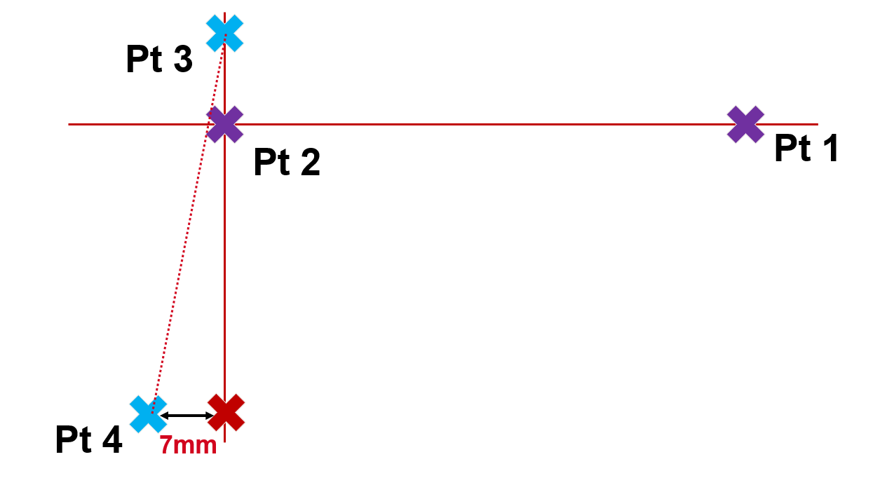 I punti viola (punto 1 e 2 della linea 1) sono considerati accurati e rappresentano un riferimento. Il punto 3 (blu) stabilisce dove dovrebbe trovarsi la seconda linea nello spazio ed è considerato accurato dove è stato misurato. Il punto 4 è il punto finale misurato della seconda linea, con una deviazione verso ovest di 7 mm rispetto alla X rossa, dove la linea avrebbe dovuto essere.