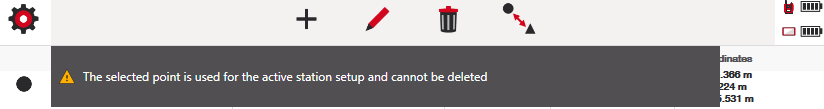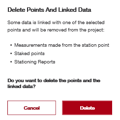 Nota che se elimini un punto di stazione, i dati collegati a quel punto di stazione saranno anch’essi eliminati, come i punti tracciati, i dati del report di stazionamento e i punti misurati tramite "misura e registra". Si consiglia di esportare i dati rilevanti dei punti prima di eliminare i punti di stazione nel caso in cui tu abbia bisogno delle informazioni in seguito.