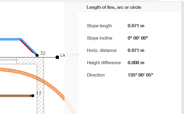 L'applicazione per la lunghezza di linea, arco o cerchio è disponibile per fornire informazioni su uno qualsiasi di questi oggetti, inclusi lunghezza, inclinazione, distanza, altezza e direzione.