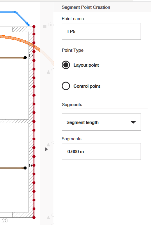Seleziona la linea che vuoi usare come linea di riferimento. Una volta selezionata, dovrebbe diventare rossa e dovrebbero apparire dei punti rossi lungo tutta la sua lunghezza. Nel menu sul lato destro, puoi cambiare il nome del punto e il tipo: punto di layout o punto di controllo (vedi questo articolo per imparare a conoscere i tipi di punti e altri aiuti sui punti).