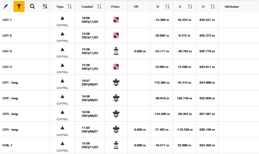 Bekijk tot slot wat er overblijft in je puntenlijst en controleer of de informatie correct is. Controlepunten verschijnen als driehoeken in je dataset. Het zijn punten op specifieke coördinaten in je gegevens, en de software kan zelfs een specifiek prismatype aan hen gekoppeld hebben, afhankelijk van hoe de controlepunten in de gegevens zijn vastgesteld.