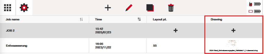 Klik op het "plus"-pictogram bovenaan het scherm om een nieuw project aan te maken, of open een project door op het groene vinkje te drukken om vervolgens naar het scherm "jobs" te gaan, waar een tekening kan worden geïmporteerd: