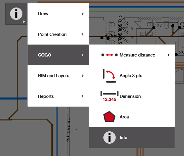 De info applicatie geeft je informatie over punten, lijnen, bogen en cirkels binnen je digitale bestand. Je ziet de lengte van objecten, start- en eindpuntcoördinaten en straalinformatie. De applicatie geeft zelfs informatie over punten die technisch gezien niet in je puntbestand staan, zoals het tikken op uiteinden van lijnen, of het zoeken naar de coördinaat van het middelpunt van een cirkel.