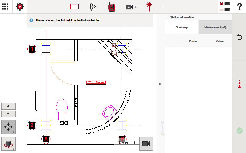 - Pierwsze dwa punkty zmierzone na pierwszej linii ustanawiają Twoją „linię odniesienia” – i jest ona uważana, dla celów obliczeniowych, za dokładną względem projektu.