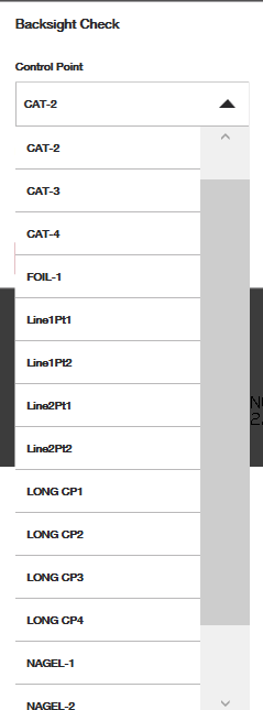 Pojawi się pełna lista punktów kontrolnych do wyboru. Zaleca się wybranie punktu kontrolnego użytego podczas ostatniego ustawienia stanowiska, aby najlepiej porównać kontrolę tylnego celu z pierwotnym ustawieniem. Jednak technicznie można wybrać dowolny punkt z listy. Domyślnie wybrany zostanie pierwszy punkt kontrolny użyty podczas ostatniego procesu ustawiania stanowiska.