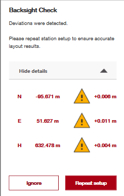 Jeśli dane z kontroli tylnego celu są złe, zaleca się ponowne ustawienie narzędzia na podanych punktach kontrolnych. Po ponownym ustawieniu warto, aby tachimetr poprowadził Cię do punktu, który wcześniej wyznaczyłeś tego samego dnia pracy, aby zbadać potencjalne odchylenia między starym a nowym ustawieniem stanowiska.