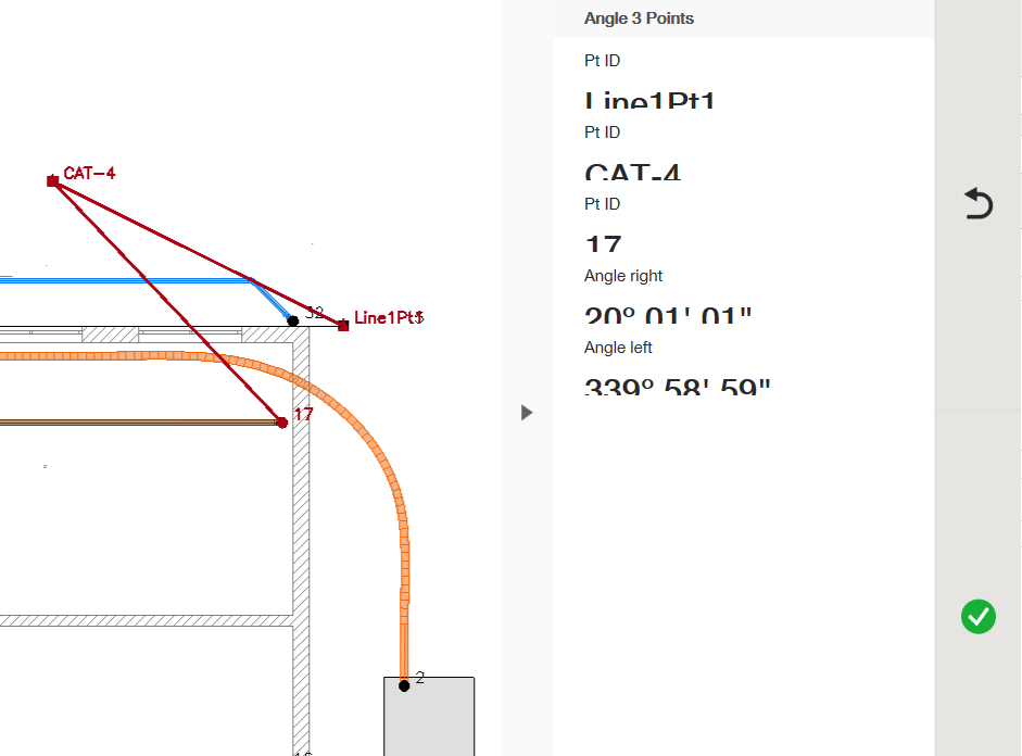 Po kliknięciu trzech punktów zobaczysz odpowiednie pomiary wyniku po prawej stronie. Etykiety trzech punktów pojawią się wymienione pod "ID punktu" lub Pt ID oraz pomiary dwóch kątów. Pomiar "Kąt prawy" podaje kąt w stopniach utworzony po prawej stronie wierzchołka, a pomiar "Kąt lewy" podaje stopnie kąta po lewej stronie wierzchołka.