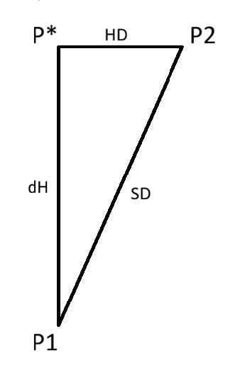 - HD (Odległość pozioma): Odległość pozioma mierzona od prawdziwej linii pionowej punktu bazowego do aktualnie mierzonego punktu. (P* do P2)