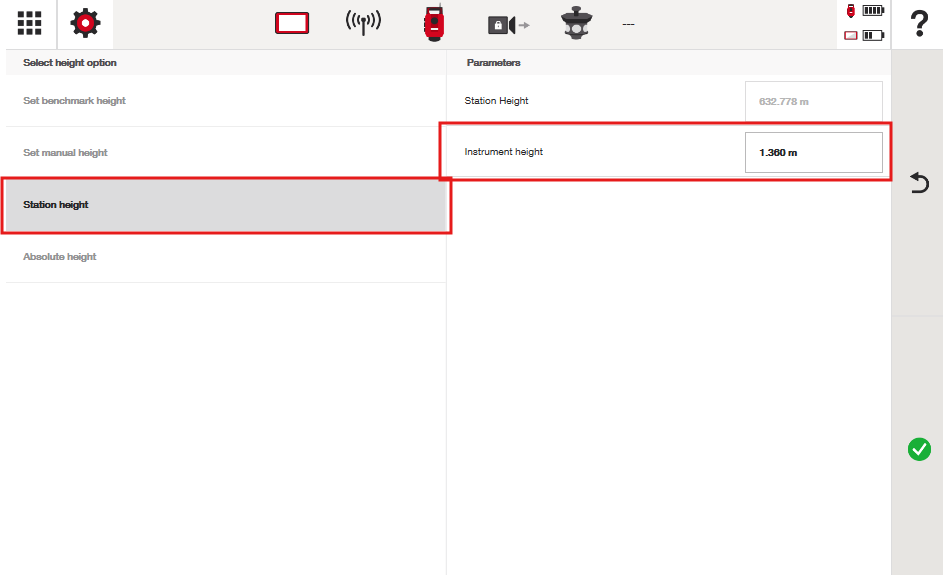 Därefter märker du att du automatiskt tas till skärmen "Stationshöjd" där det enda alternativet är att ställa in "instrumenthöjd." Detta beror på att totalstationen antar punkthöjden för den punkt vi använde under stationeringen (632,778 m).