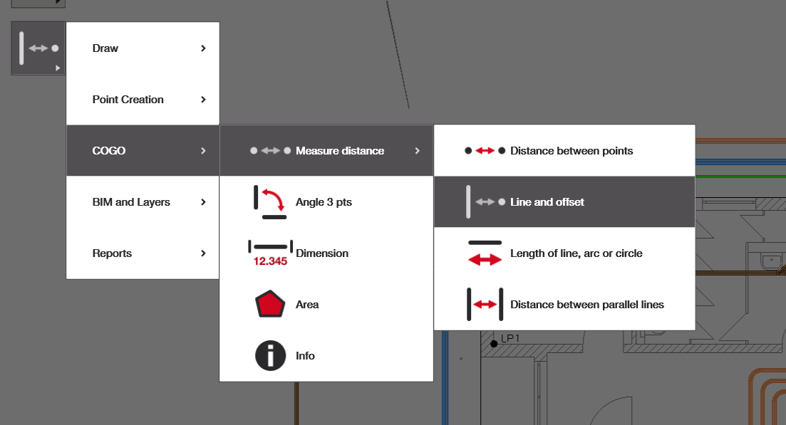 Linje- och förskjutningsapplikationen är ett utmärkt sätt att snabbt verifiera avståndet för punkter från en specifik linje. Till exempel, att verifiera utformningen av förankringspunkter från en specifik rutnätslinje, eller att verifiera den uppmätta platsen för specifika objekt från en vägg.