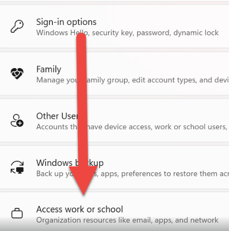 - Välj "Åtkomst till arbete eller skola"