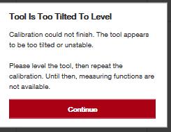 Denna artikel kommer att diskutera vad som kan orsaka felet "Verktyget är för lutat för att vara i nivå" (se bild nedan) och hur man eventuellt kan åtgärda det. Observera - denna felåtgärd gäller även för felet, "Verktyget är inte i nivå."